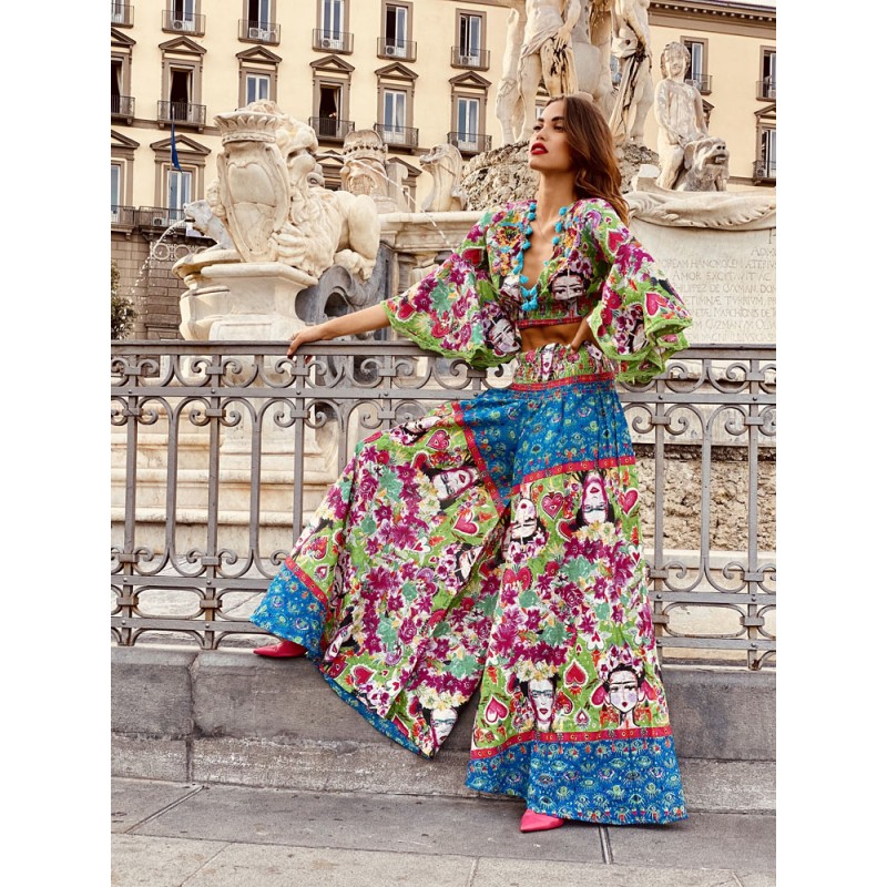 Conjunto realizado en algodón estampado. Top con escote V, cintura elastizada y mangas largas terminadas en volados. Terminación de ganchillo en mangas y bajos. Precioso estampado de Frida Kahlo