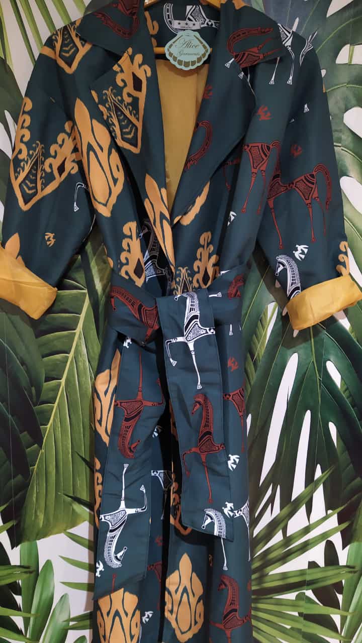 Gabardina larga con bolsillos y cinto, estampado diseño con forro