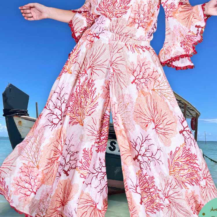 Pantalón palazzo de algodón con estampado Corales y terminaciones ganchillo