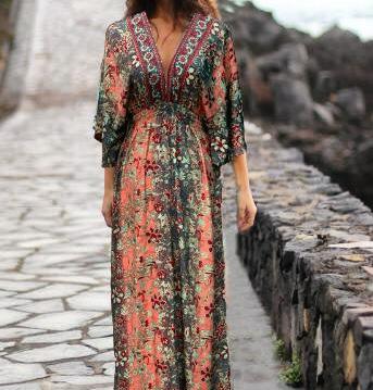 Vestido estilo mexicano largo de poli-crepe con mangas, apertura en los lados y exotico estampado.