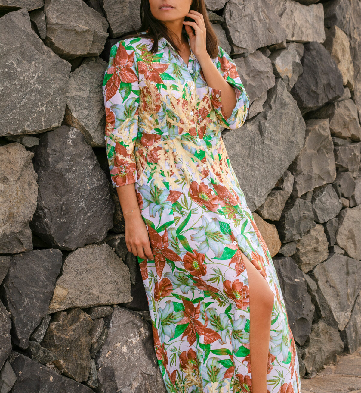 Hermoso vestido largo algodon estampado floral con manga 3/4 y adornos.