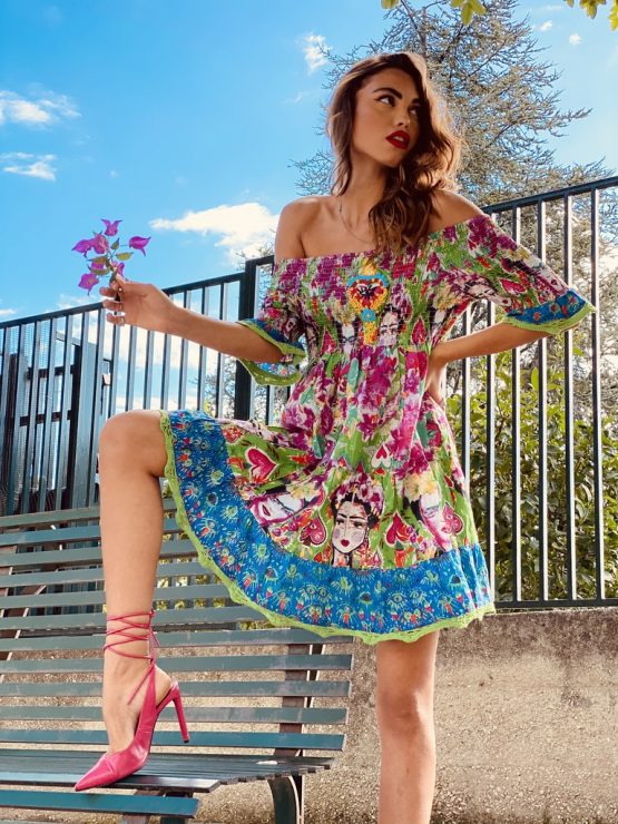 Vestido 100% algodón, hombros descubiertos adornado con detalles de ganchillo, mangas de trompeta con banda elástica y estampado artistico mexicano